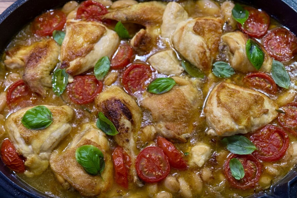 Mit trockenem Weißwein ablöschen, einmal aufkochen und eine Minute köcheln lassen. Dann mit der guten Brühe auffüllen. Die Tomaten halbieren und salzen, die Bohnen abgießen. Alles mit den Keulenteilen und den Hähnchenflügeln zugeben. Nur die Brustteile bleiben immer noch draußen!