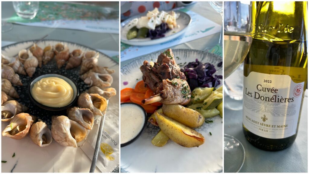 Los geht es mit Hamachi-Ceviche mit französischen Haselnüssen. Zum Hauptgang saftiges Schweinefilet mit kurzer Jus, Gemüse und neuen Kartoffeln. Großartig der arme Ritter („pain perdu“) aus Brioche mit Zitrus-Cassis-Marmelade und Vanillecreme-Sahne. Ich freue mich über eine regionale Käseauswahl von Érick Hicks aus Trévérien.